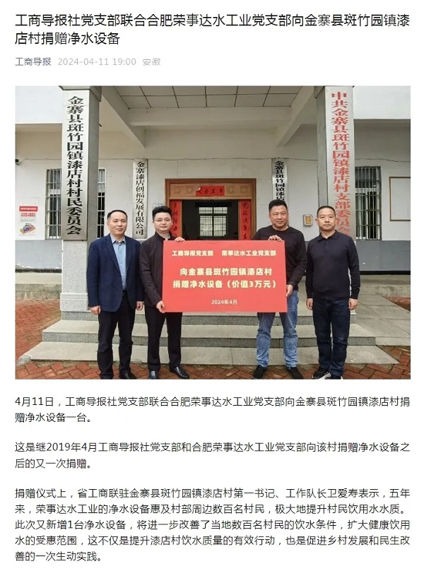 • 榮事達(dá)水工業(yè)公司黨支部攜手工商導(dǎo)報(bào)社黨支部捐贈(zèng)凈水設(shè)備,助力金寨縣漆店村美麗鄉(xiāng)村建設(shè)!