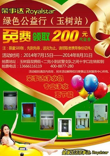 •     為實(shí)現(xiàn)“讓中國(guó)人喝上安全水”的夢(mèng)想,榮事達(dá)水工業(yè)公司將在全國(guó)開展 “綠色公益行”活動(dòng),通過一系列為民、惠民的宣傳和服務(wù),關(guān)注居民飲水健康,倡導(dǎo)綠色生活。