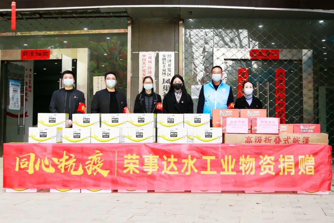 榮事達水工業(yè)集團在得知這一消息后,第一時間聯合黨支部來到長豐縣雙鳳開發(fā)區(qū)鳳巢社區(qū)黨群服務中心,為防控一線人員送去帳篷、方便面、飲用水等生活所需物資。
