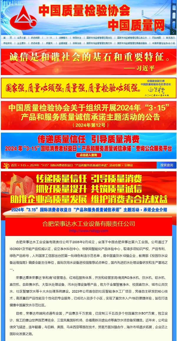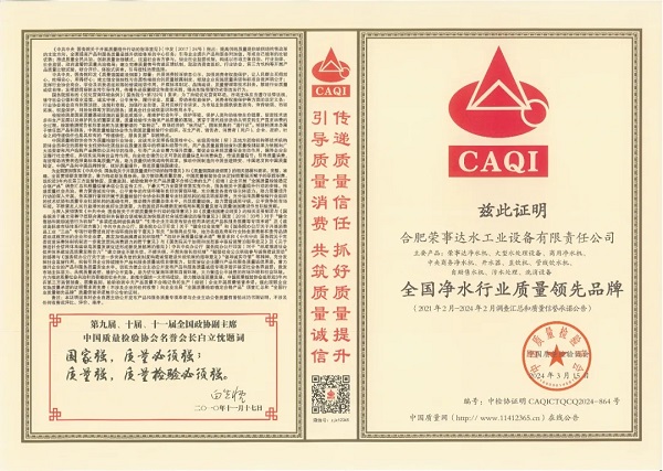 在由中國質量檢驗協會主辦的2024年“3·15”產品和服務質量誠信承諾的主題活動中,榮事達水工業公司憑借卓越的產品品質及良好的社會形象,獲得協會以及權威專家的一致認可,榮膺 “全國產品和服務質量誠信示范企業 ”“全國凈水行業質量領先企業”“全國凈水行業質量領先品牌”“全國產品和服務質量誠信品牌”“全國質量檢驗穩定合格產品”“全國質量檢驗信譽保障產品”“全國消費者質量信譽保障產品 ”多項榮譽。
