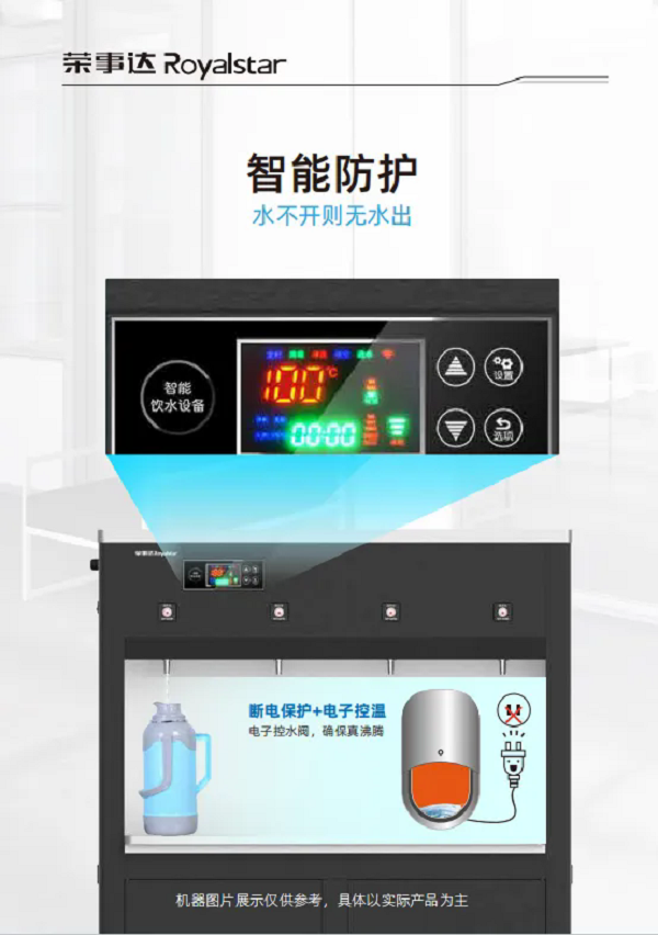 設備采用節能熱交換技術,熱損低,更節能;保溫結構設計,保溫效果好。六個水龍頭設計,有效應對飲水量大與飲水集中的問題,確保供水順暢。五級過濾,RO反滲透技術,有效濾除水中的泥沙、鐵銹、重金屬、余氯等有害物質,確保水質干凈;智能防護功能,斷電保護、電子控溫、七重保護,可充分保障師生使用安全。