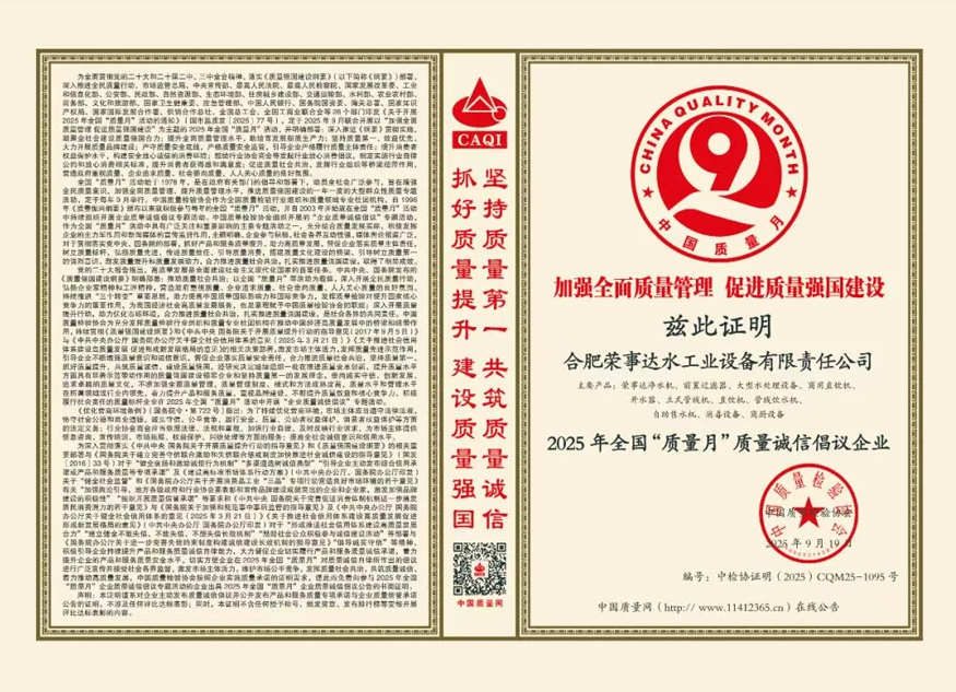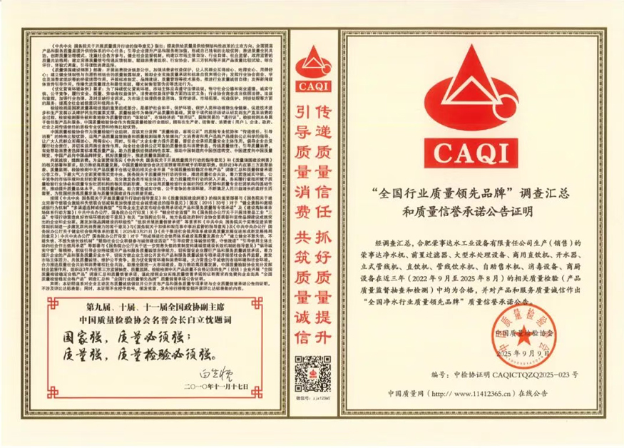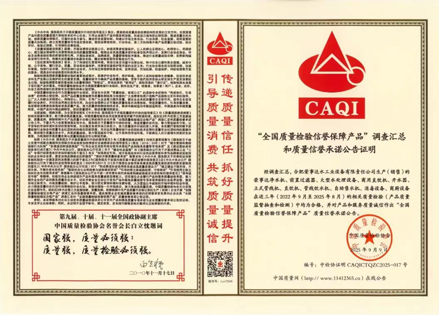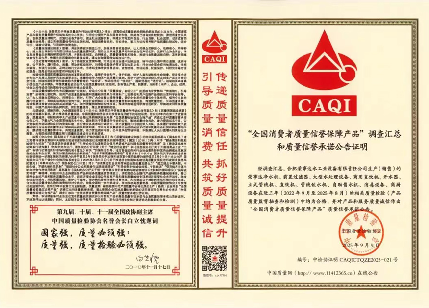 加強(qiáng)質(zhì)量支撐,共建質(zhì)量強(qiáng)國(guó)。在由中國(guó)質(zhì)量檢驗(yàn)協(xié)會(huì)牽頭組織的2025年全國(guó)“質(zhì)量月”企業(yè)質(zhì)量誠(chéng)信倡議專題活動(dòng)中,榮事達(dá)水工業(yè)公司憑借長(zhǎng)期以來對(duì)產(chǎn)品品質(zhì)的嚴(yán)苛堅(jiān)守與積極正向的社會(huì)形象,成功通過協(xié)會(huì)多維度審核與專家團(tuán)專業(yè)評(píng)定,最終一舉斬獲“全國(guó)凈水行業(yè)質(zhì)量領(lǐng)先品牌”“全國(guó)質(zhì)量誠(chéng)信先進(jìn)企業(yè)”“全國(guó)質(zhì)量檢驗(yàn)信譽(yù)保障產(chǎn)品”“全國(guó)質(zhì)量檢驗(yàn)穩(wěn)定合格產(chǎn)品”“全國(guó)消費(fèi)者質(zhì)量信譽(yù)保障產(chǎn)品”五項(xiàng)榮譽(yù)。