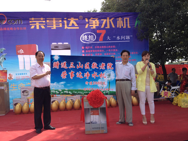 榮事達水工業公司一直踐行公益,關注社會弱勢群體飲水安全,蕪湖營銷管理中心自成立以來,開展了各種形式的公益活動。7月上旬,榮事達凈水機攜手蕪湖市老年協會到三山敬老院進行慰問演出,為老人們奉上了精彩的歌舞表演,給他們帶去了歡樂,并向該院捐贈了凈水機,讓老人們能喝上放心水。