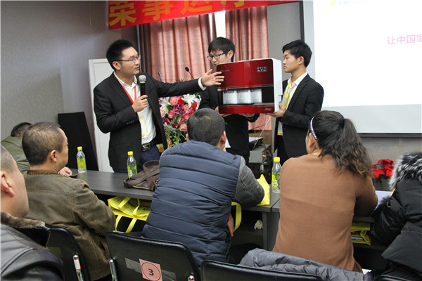 產(chǎn)品是終端營(yíng)銷的基石,榮事達(dá)推出箱體LED純水機(jī),渠道發(fā)展部劉總對(duì)產(chǎn)品進(jìn)行了講解。外觀上,產(chǎn)品以大紅色為主色調(diào),弧形立式設(shè)計(jì)更精致美觀上檔次。功能上,產(chǎn)品增壓、自吸可一步到位,有效攻克水壓不足、不穩(wěn)問題;配置先進(jìn)RO反滲透膜,五級(jí)過濾系統(tǒng),凈化功能卓越;LED智能顯示,運(yùn)行狀態(tài)一目了然等。此次會(huì)議,公司還推出高端智能凈水機(jī),滿足消費(fèi)者的不同需求。