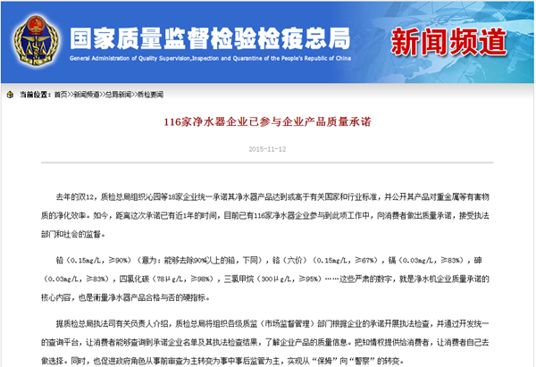 質檢總局|116家凈水器企業參與企業產品質量承諾 榮事達位列前茅