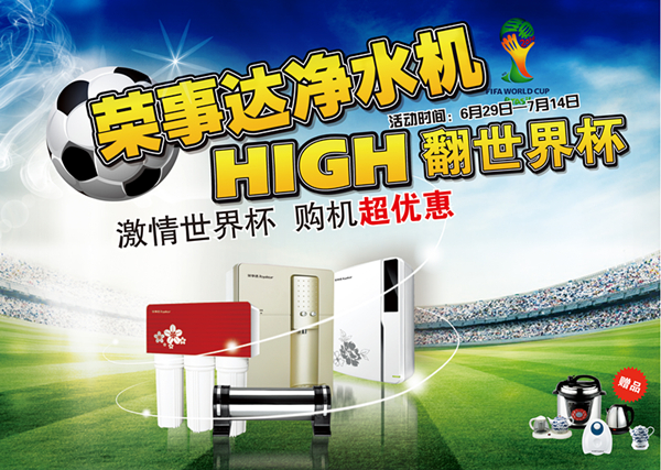 •     全世界共襄的足球大戲已經拉開戰幕,四年一度的王者之戰正趨于激烈。為回饋廣大消費者對榮事達凈水機一貫的支持與厚愛,值巴西世界杯之際,榮事達凈水機將于2014年6月29日至7月14日面向全國開展“High翻世界杯”活動。活動期間,榮事達凈水機將在各地開展一系列世界杯主題讓利活動,為在南美鏖戰的足球英雄們搖旗吶喊!